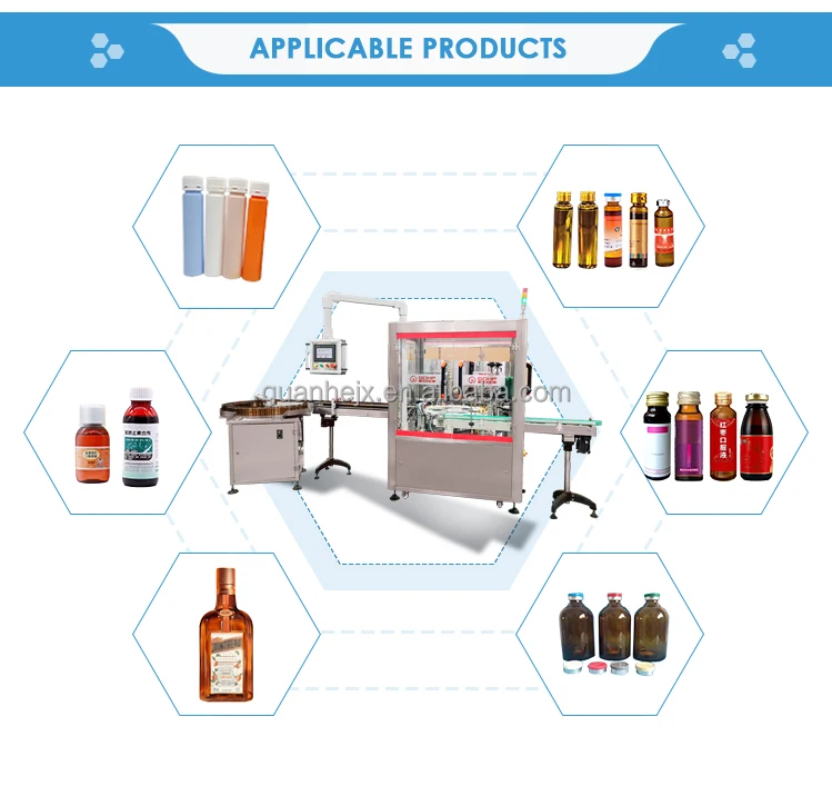 Advantage | Fully automatic production line, reducing labor costs. PLC control, simple and convenient operation. High filling accuracy. The capping strength can be adjusted and the pass rate is high. |